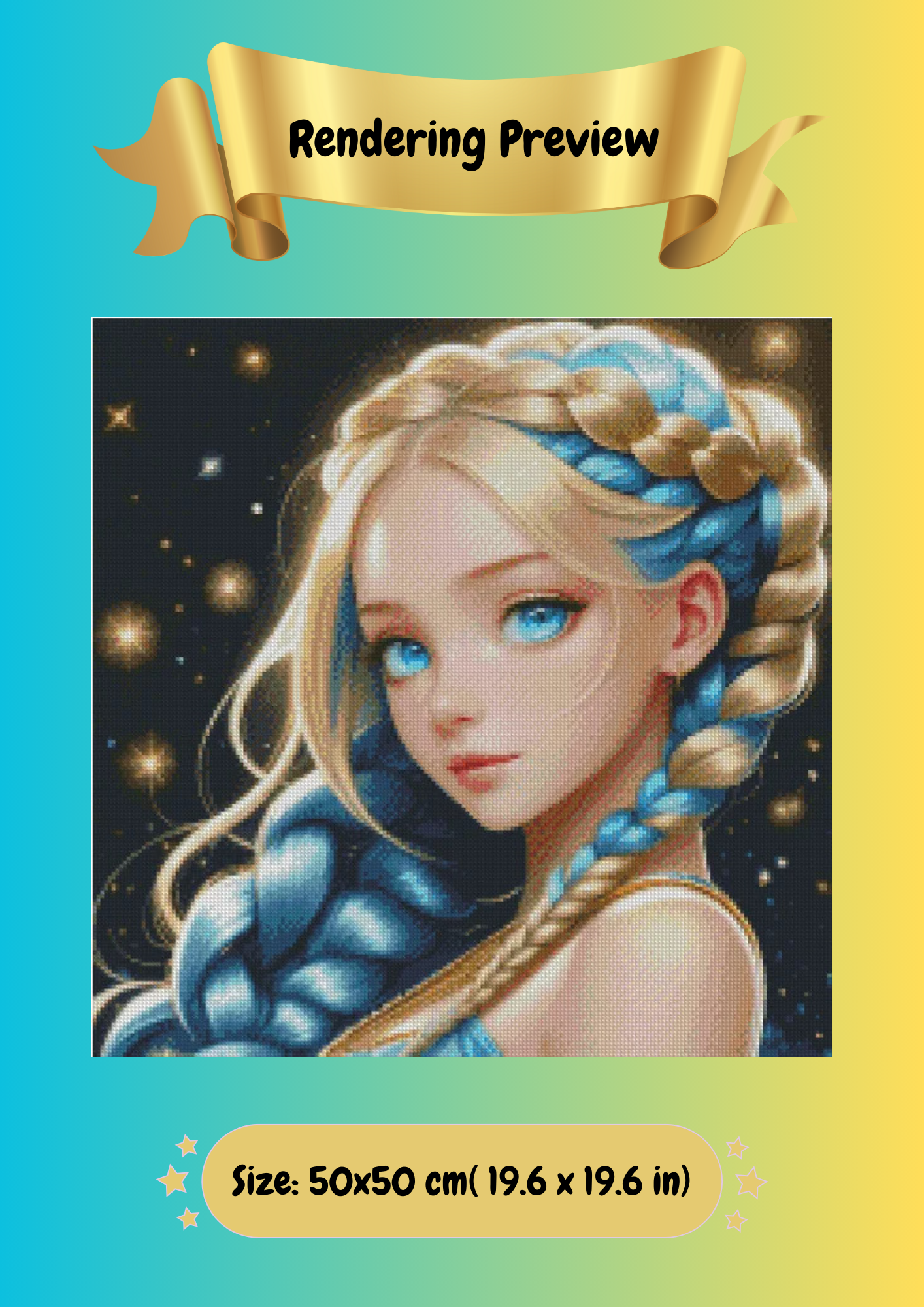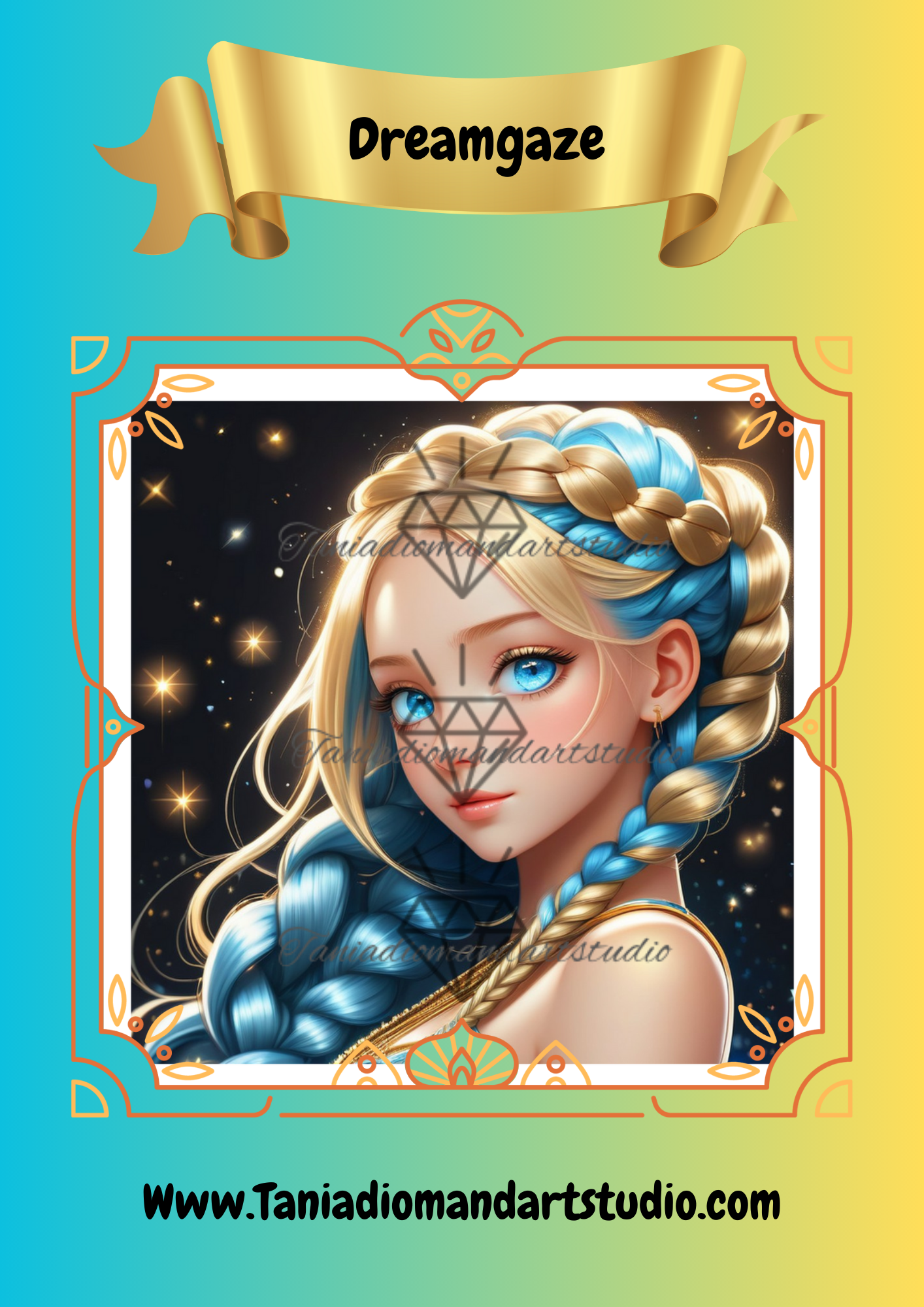 Embrace the rad charm of Dreamgaze a splendid Diomand painting kit that captures the enchanting beauty of dreamgaze a princess of dreams with her flowing blonde and blue hair braid.Her stunning sparkling blue eyes and rosy cheeks are highlighted by a magnificent starlights.