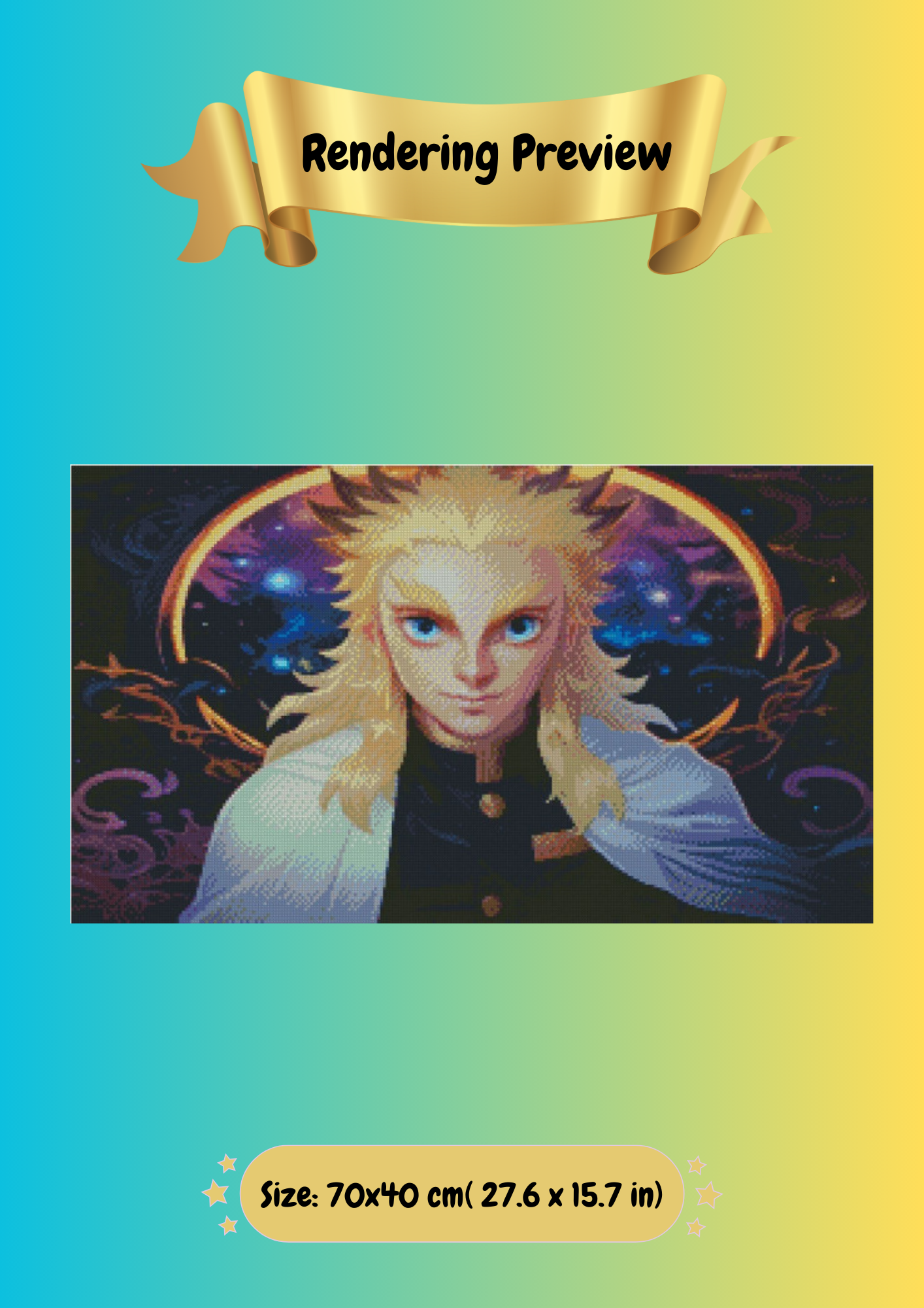 Each gem placed on this painting highlights the intricate details of "Kyojuro" iconic Flame Hashira. This artwork invites you to capture not just the visual intensity of "Kyojuro" but also the fiery warmth of his spirit a legacy that continues to inspire even in the face of darkness.