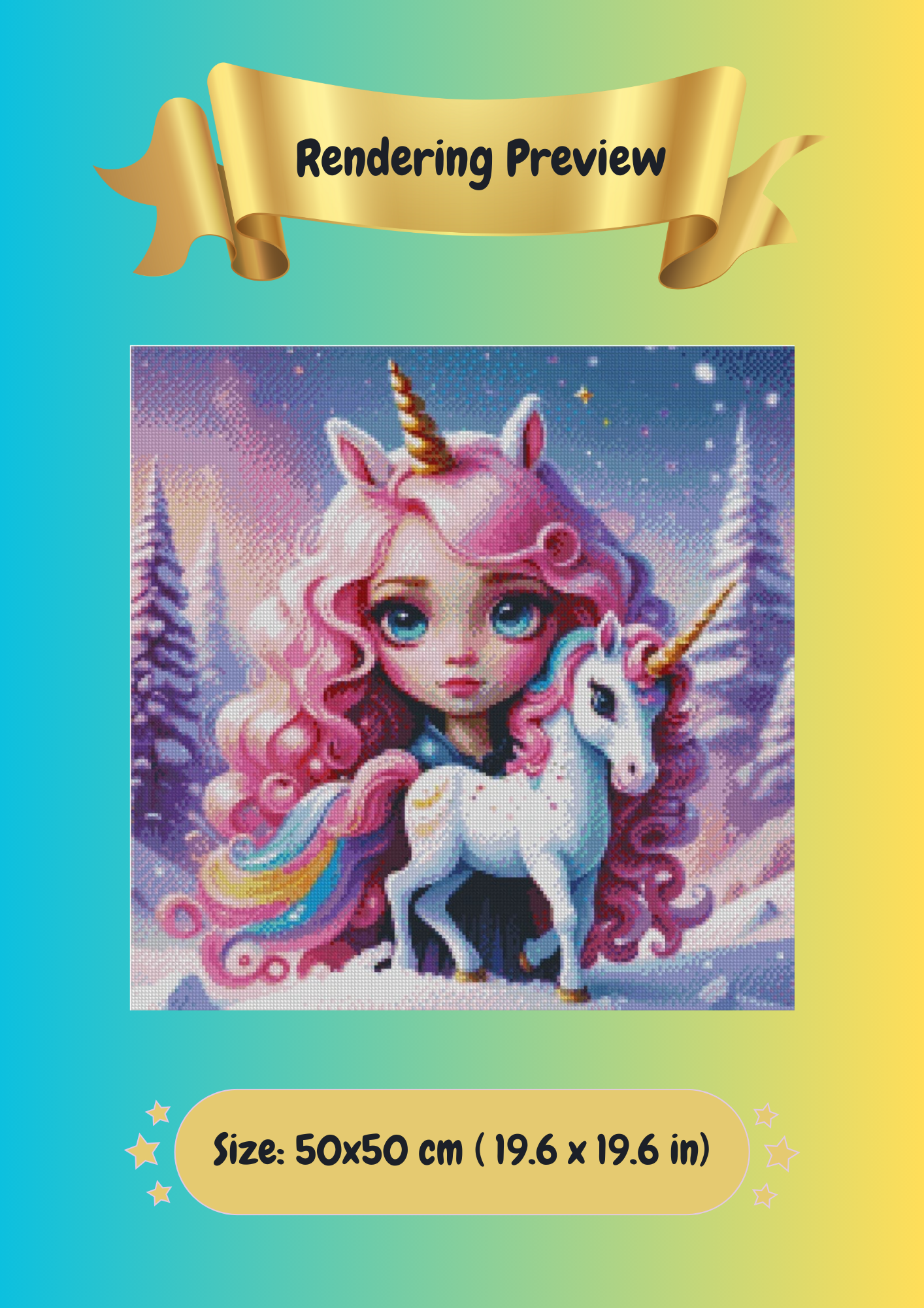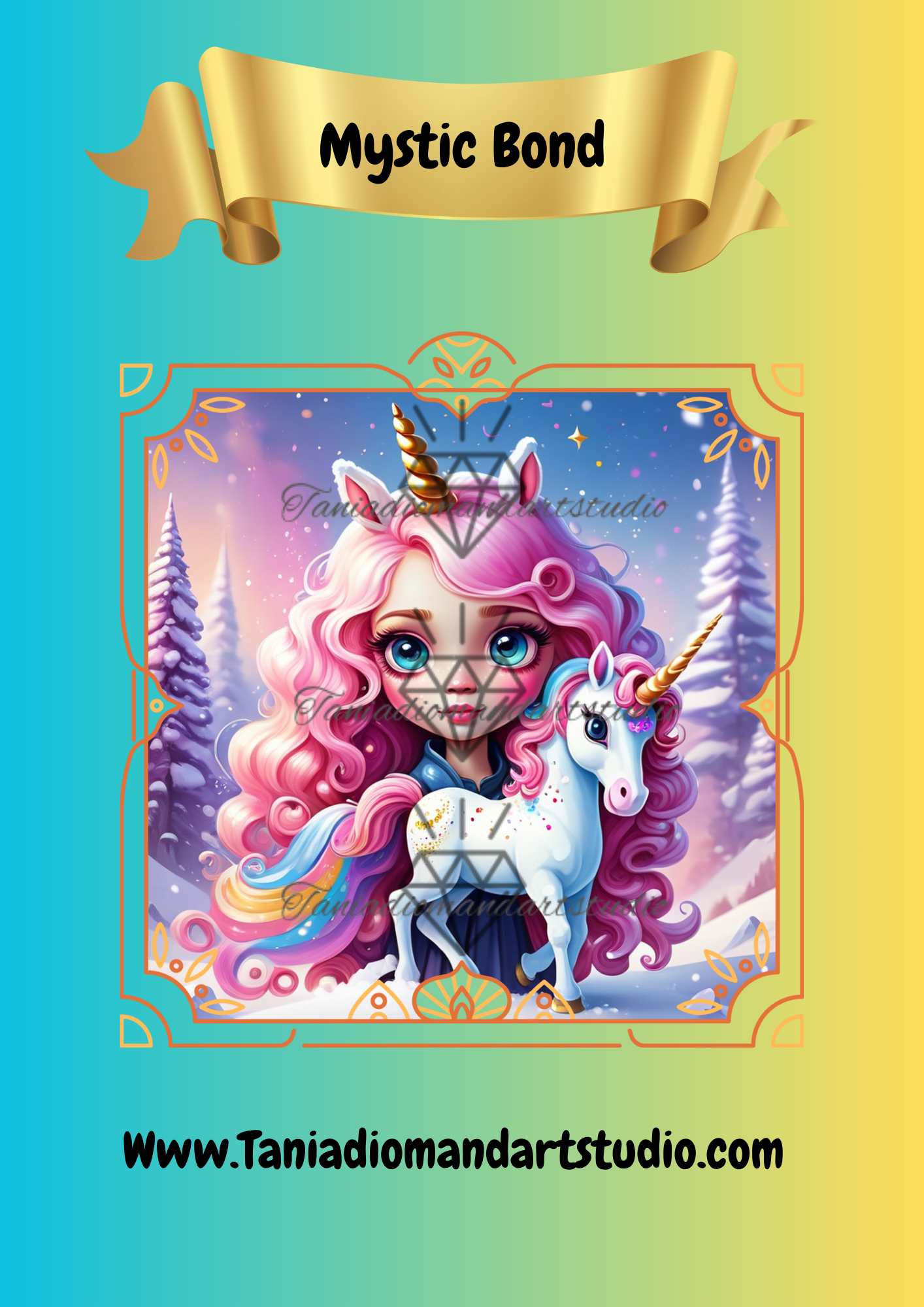 Embrace yourself into Mystic Bond u captures a magical story scene of friendship and adventure in a winter, snow covered mountain landscape. She stands gracefully amidst a world of soft pink tinted trees and shimmering snow, her presence brightened by her faithful loyal companion a radiant rainbow unicorn. Her pink curly hair flows around her face, and her deep blue eyes convey wonder, kinder and strength. This scene celebrates the mystical power of bonds, friendship and a connection to the magic in nature, together they bring colour and warmth to a magical snow covered mountain landscape, reminding us that true bonds create light even in the coldest of places.