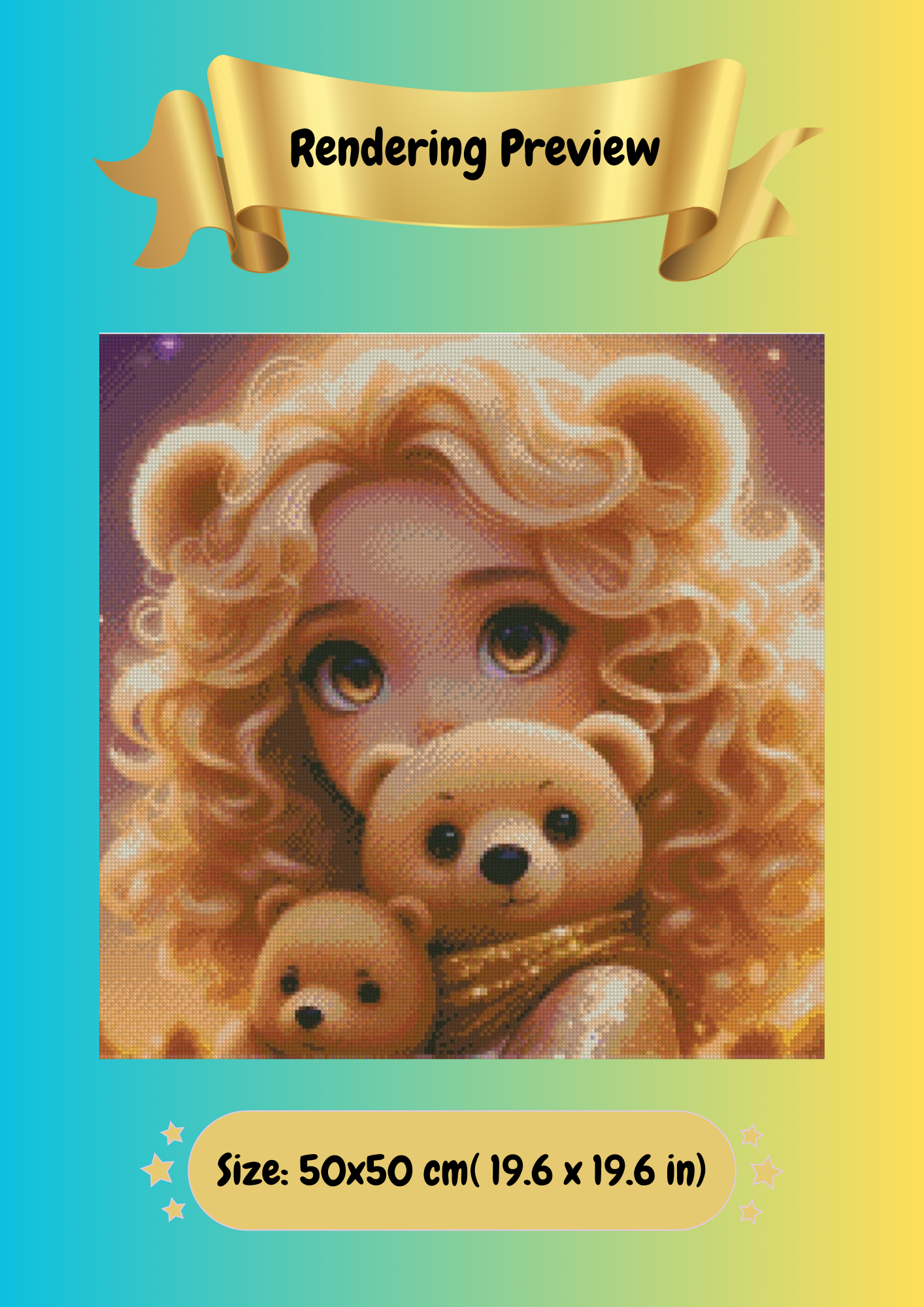 In a realm where dreams shimmered like stardust , there stood- a cascade of golden waves framing her delicate face. Her hair spilled like liquid sunlight , gleaming against the ethereal glow of a golden and purple background.